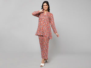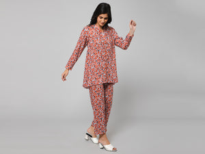 Front opening shirt with a loose fit and fitted pants along with this Co-ord set makes it very comfortable to wear during summer outings.