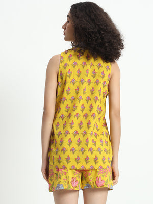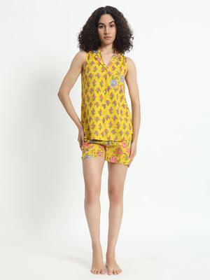 DESCRIPTION: Pure Cotton screen print crafted with the finest breathable fabrics made in comfortable front button open style to keep you cool and relaxed. Loose fit, sleeveless shirt with elasticated shorts.