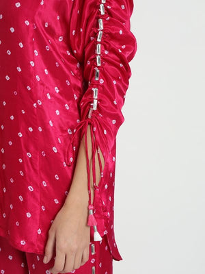 DESCRIPTION: Shine in this exquisite Co-ord set crafted with pure hand Bandhani work, features hand stitched white glass stones embellishments on the sleeves, pants & collar.