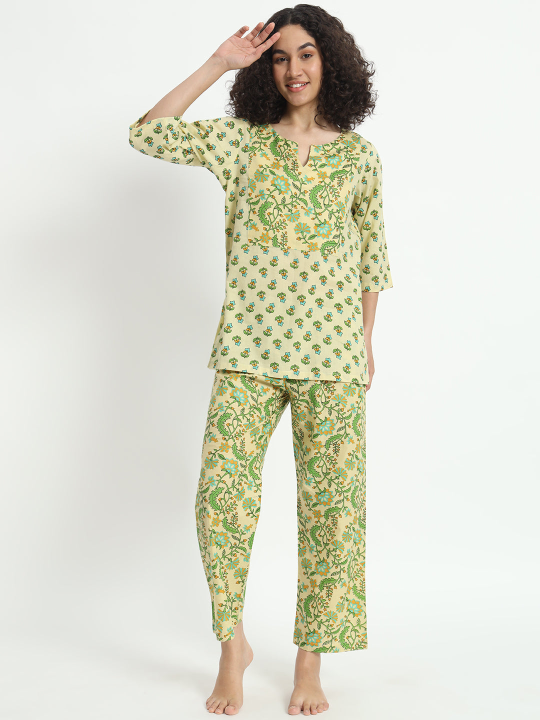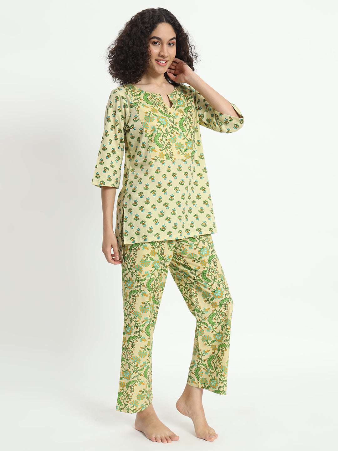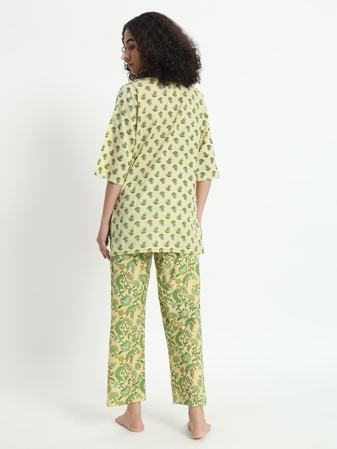 DESCRIPTION: Pure Cotton screen print crafted with the finest breathable fabrics made in comfortable Hi-Low kurti style to keep you cool and relaxed. Loose fit with 3/4th sleeves & full length elasticated pajama.