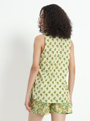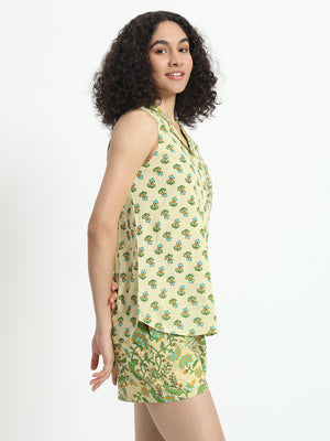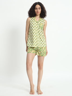 DESCRIPTION: Pure Cotton screen print crafted with the finest breathable fabrics made in comfortable front button open style to keep you cool and relaxed. Loose fit, sleeveless shirt with elasticated shorts.