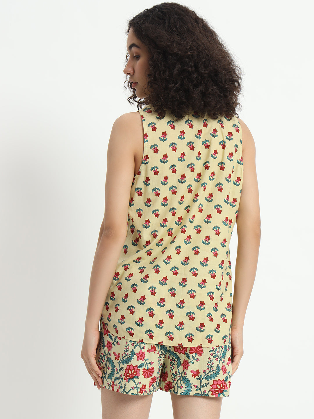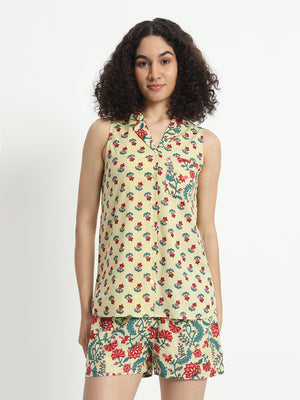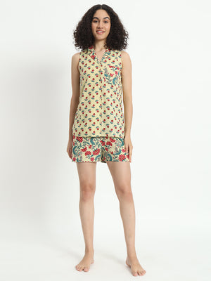 DESCRIPTION: Pure Cotton screen print crafted with the finest breathable fabrics made in comfortable front button open style to keep you cool and relaxed. Loose fit, sleeveless shirt with elasticated shorts.