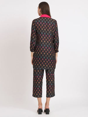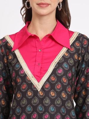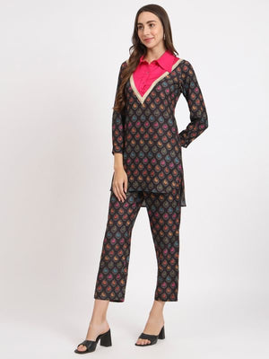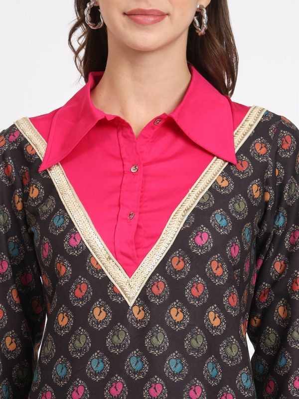 DESCRIPTION :Sets crafted with meticulous attention to detail, feature a unique half shirt look & delicate lace detailing on the neck, adding a touch of elegance to your ensemble.