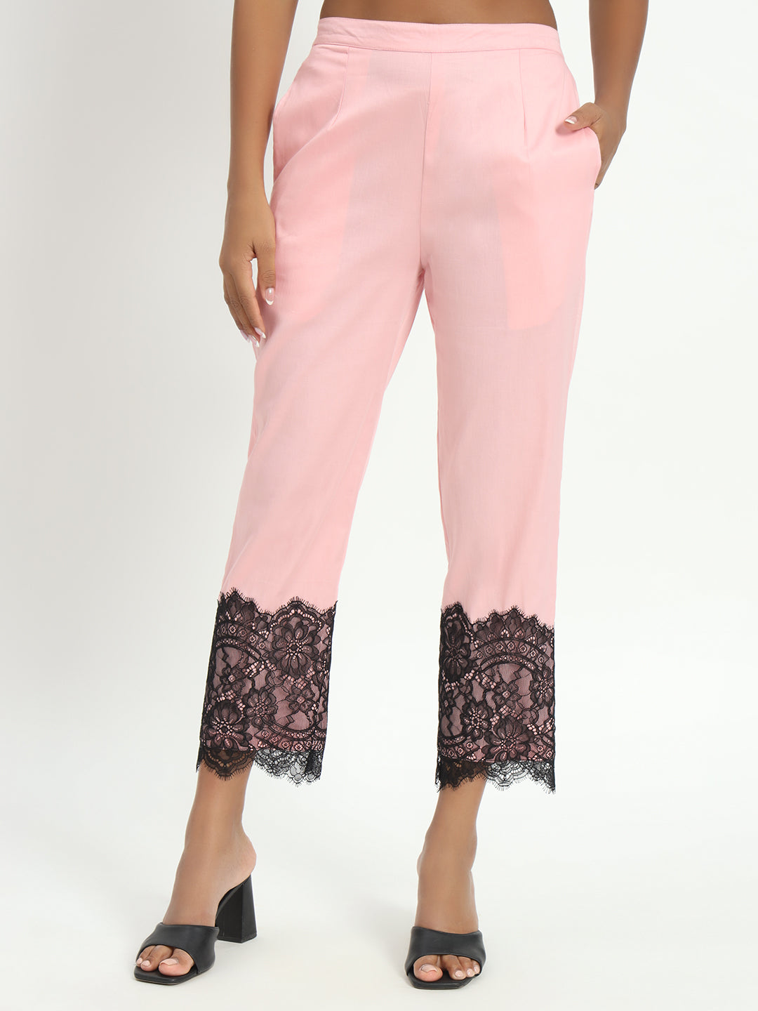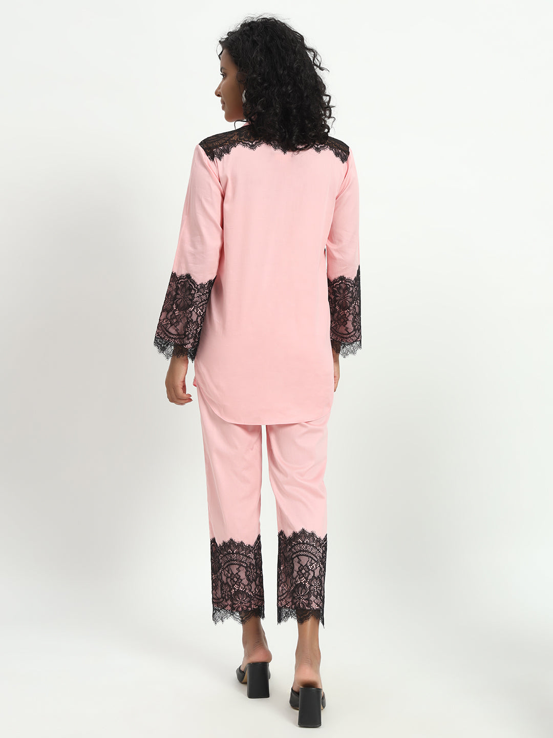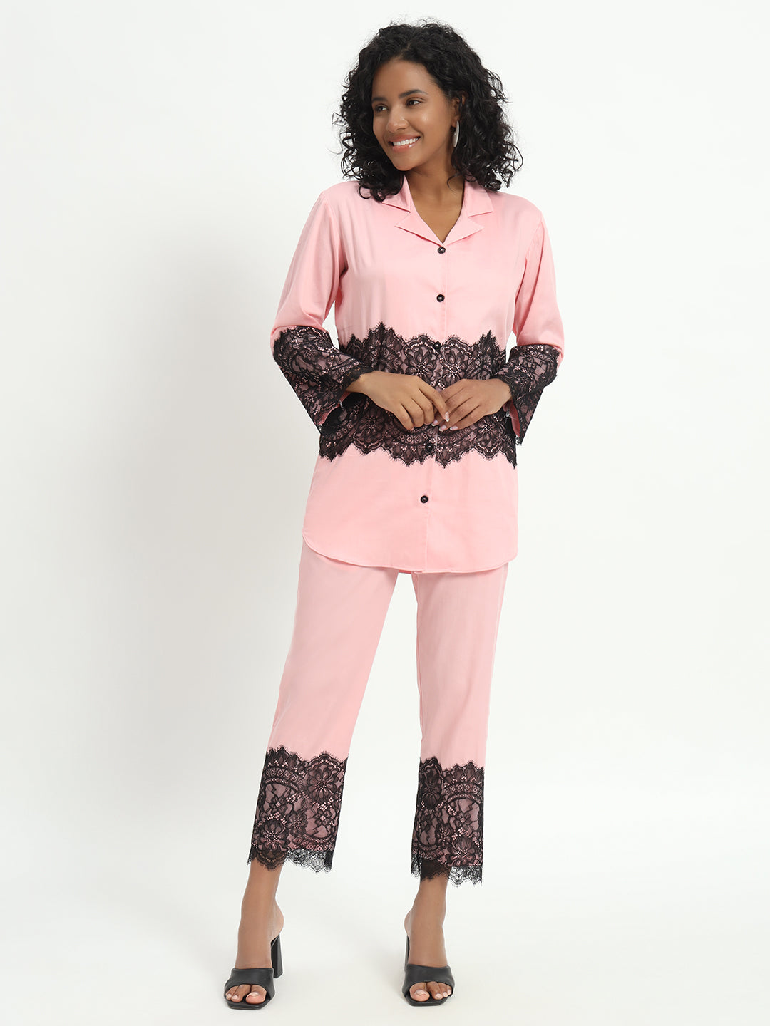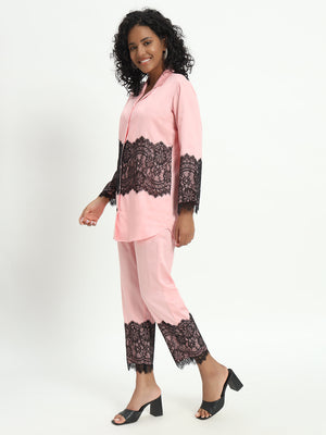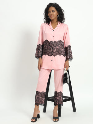 Crafted with meticulous attention to detail, the Co-ord set features a chic coat-style collar and enchanting chantilly lace ( Famous Silk Laces) accents that adorn the sleeves, waist, and pants. The harmonious color palette and impeccable tailoring create a look that's both effortless and eye-catching, ensuring you'll turn heads wherever you go.