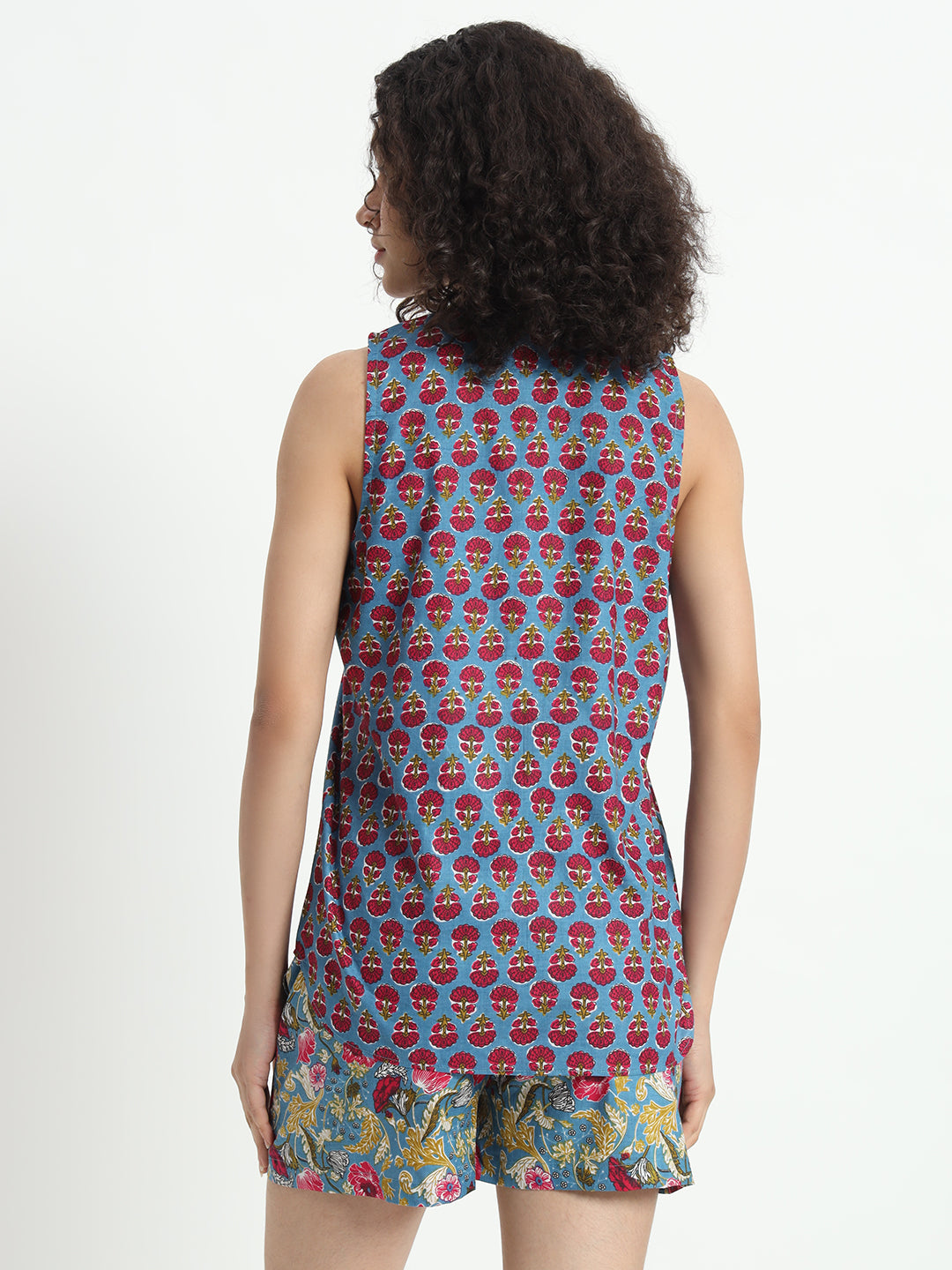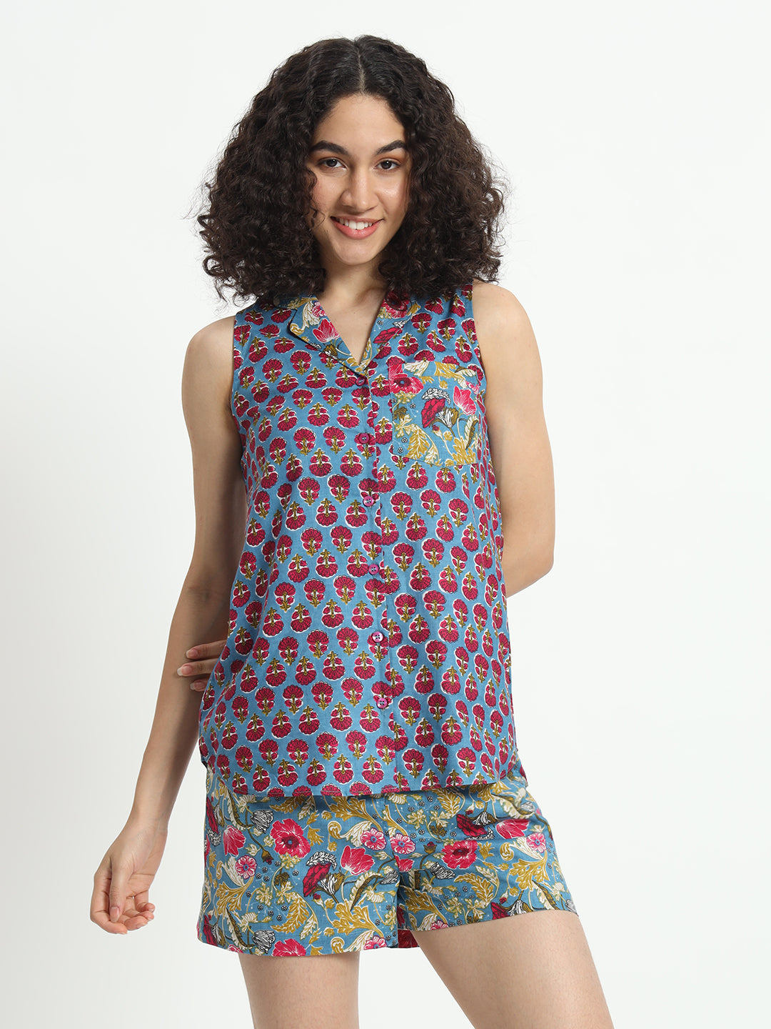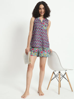 DESCRIPTION: Pure Cotton screen print crafted with the finest breathable fabrics made in comfortable front button open style to keep you cool and relaxed. Loose fit, sleeveless shirt with elasticated shorts.