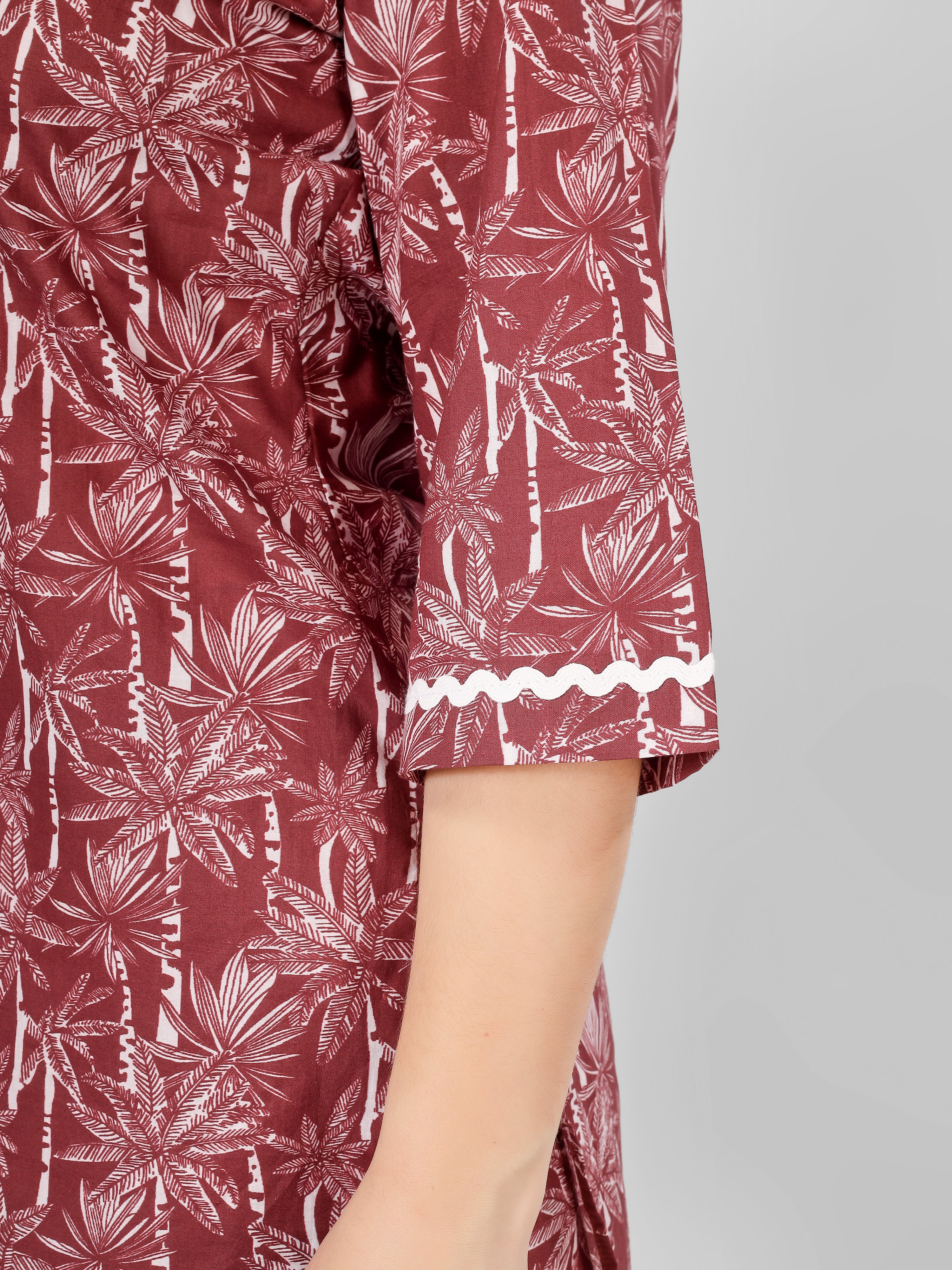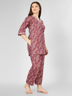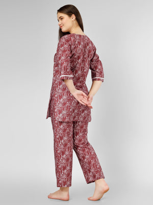 Featuring a trendy kurti-style top complemented by elasticated pajama bottom, this loungewear provides the perfect fit that moves with you, whether you're sipping tea or enjoying a movie marathon. The delicate lace detailing on the neck and sleeves adds an elegant touch that elevates your lounging experience.