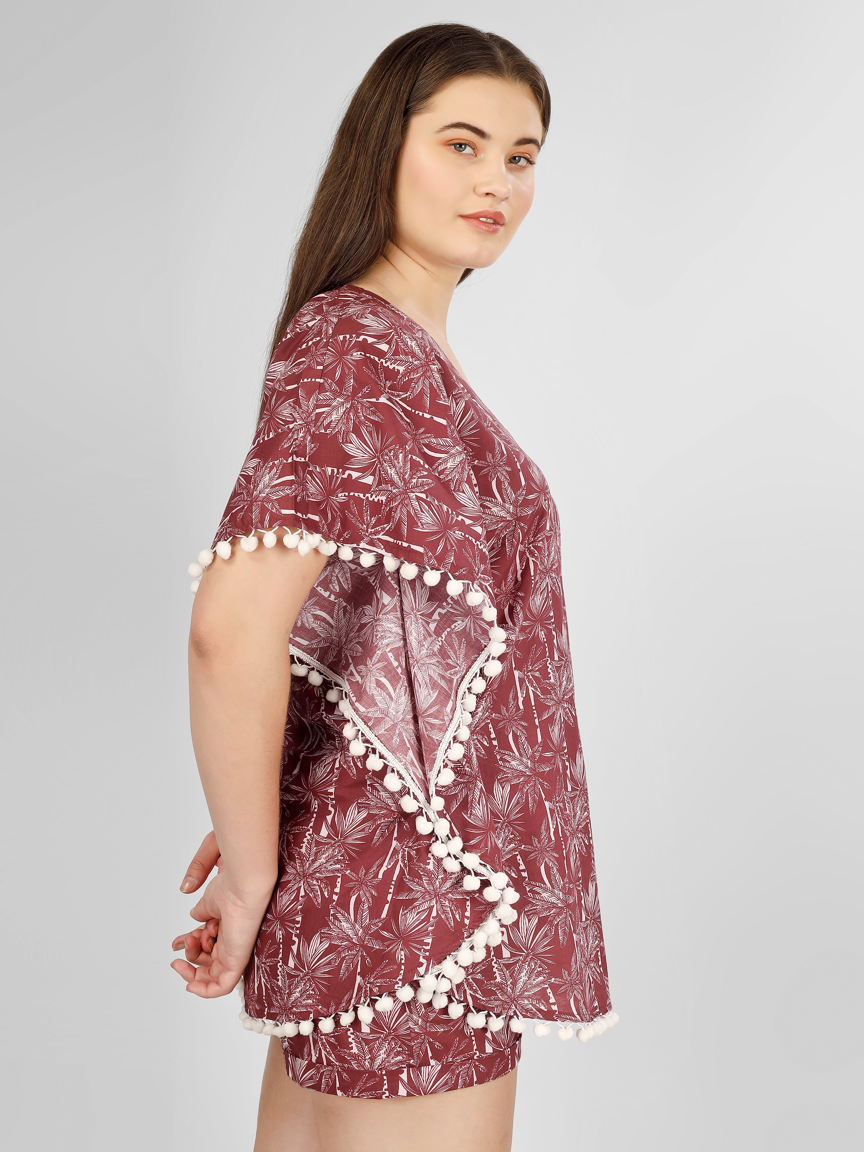 The delicate pom pom lace detailing adds an extra touch of charm, making this nightwear not only functional but also fabulously fashionable.The comfortable fit and stylish Kaftan design paired with shorts provide the perfect balance of elegance and ease, allowing you to lounge gracefully at home