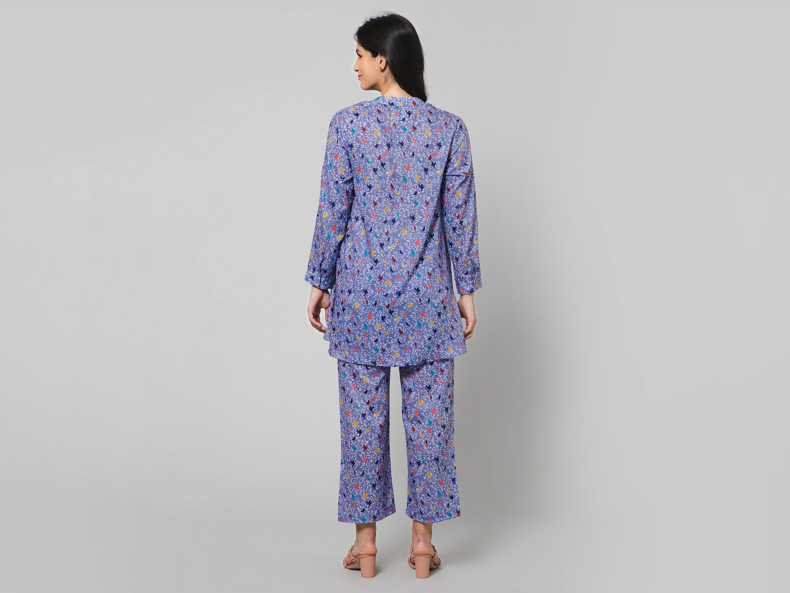 Front opening shirt with a loose fit and fitted pants along with this Co-ord set makes it very comfortable to wear during summer outings.