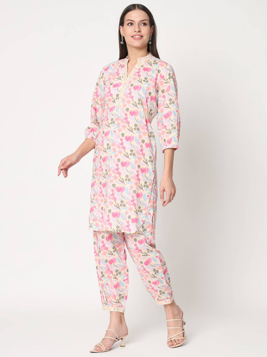 DESCRIPTION : Elevate your style with these stunning Co-ord sets which are designed with intricate lace appliqué on waist & neck. These sets beautifully blend ethnic charm with modern twist.