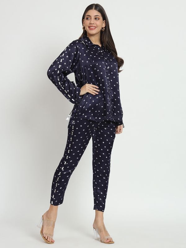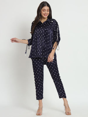 Indulge in luxury with loose shirt style top offers a comfortable yet stylish fit, white the fitted pants accentuate your curves in all the right places.