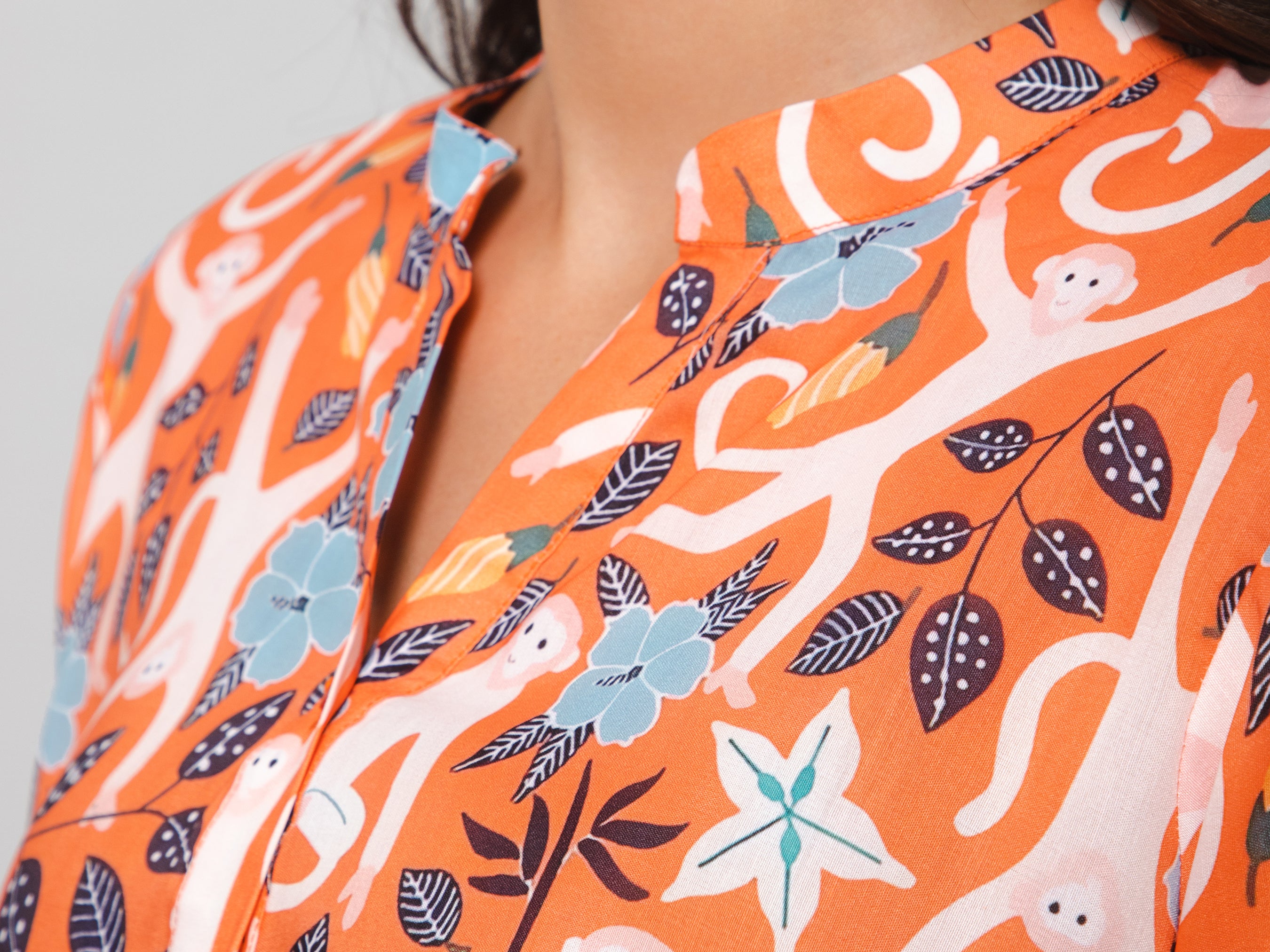 Front opening shirt with a loose fit and fitted pants along with this Co-ord set makes it very comfortable to wear during summer outings.