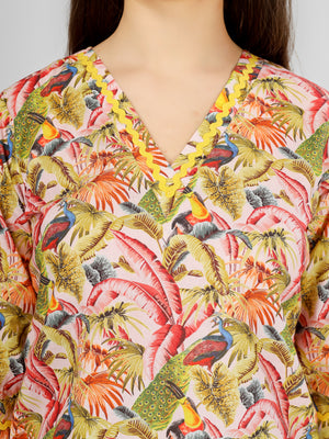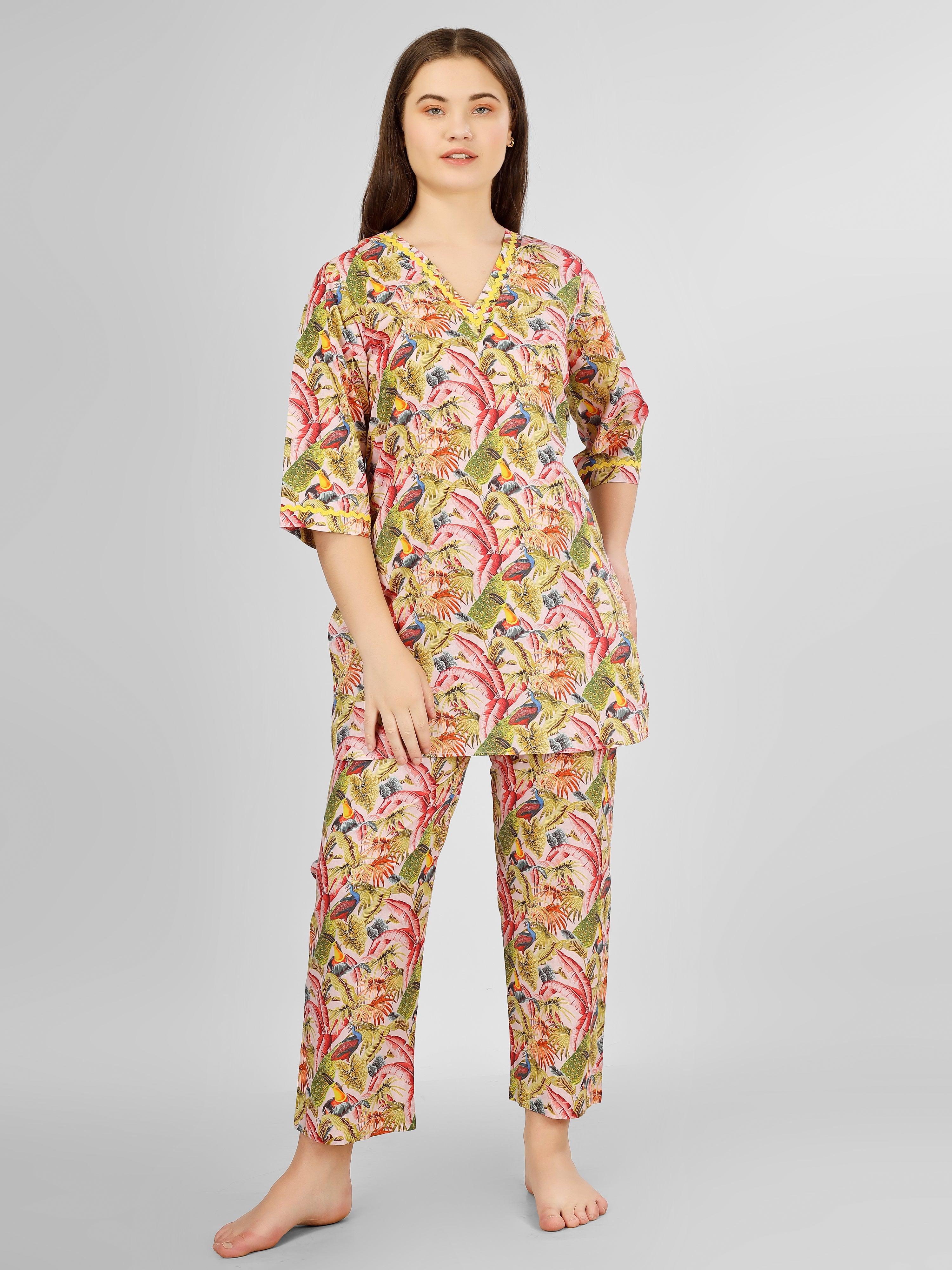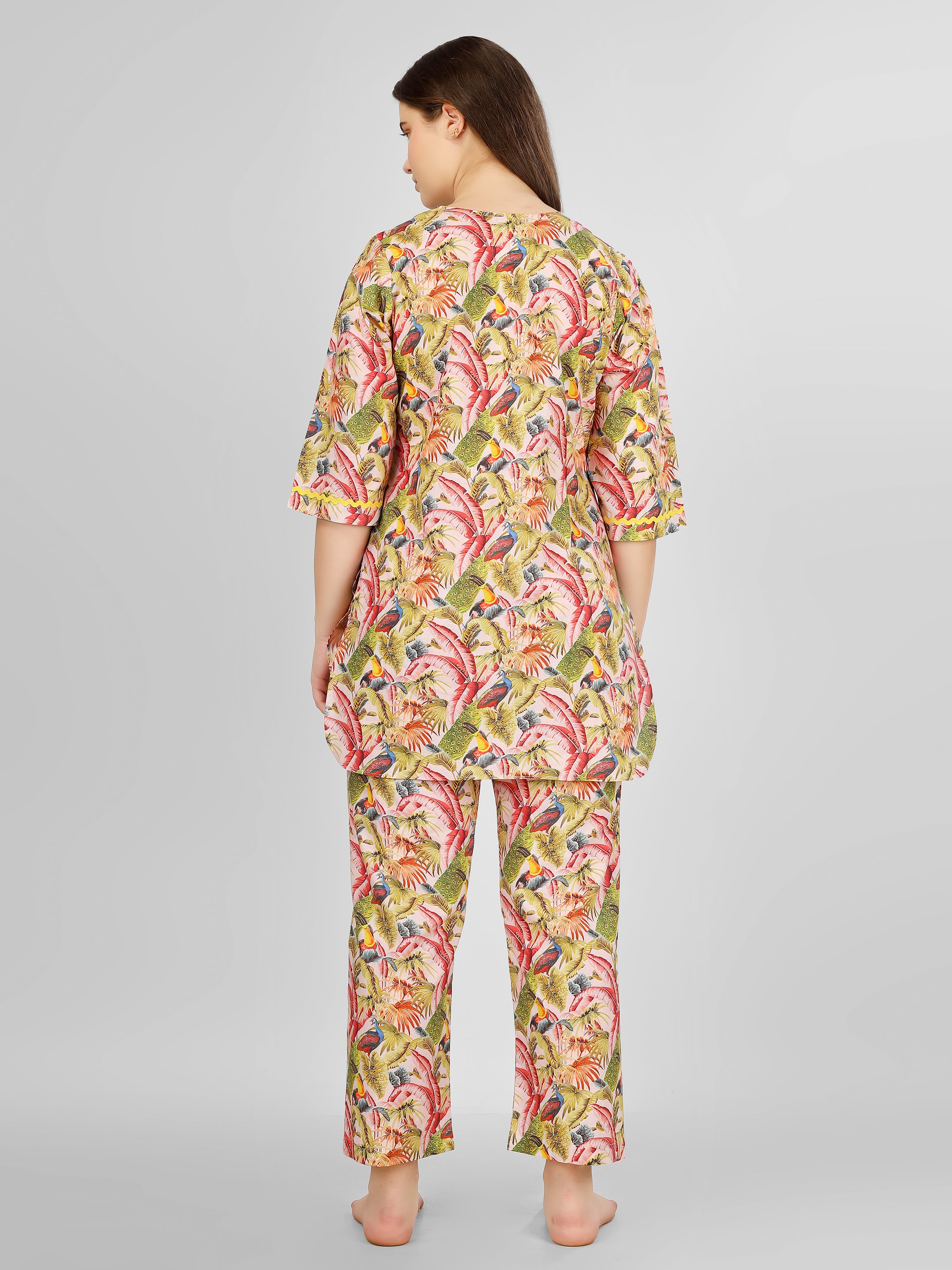 Transform your relaxation time into a stylish affair with our exquisite Loungewear set. Crafted from 100% cotton, this collection ensures unparalleled comfort while keeping you effortlessly chic. The enchanting spring palm prints bring a refreshing vibe to your home, perfect for those laid-back weekends or cozy evenings in.