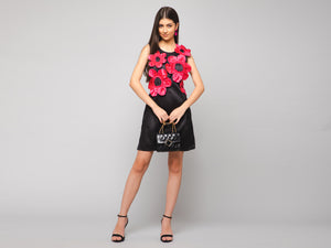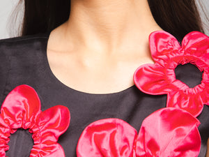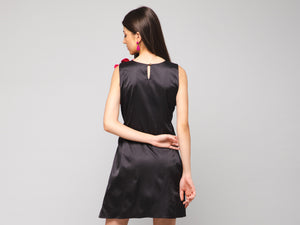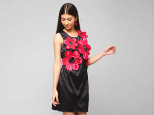 This black satin dress is adorned with pink satin flowers that add a touch of sophistication to any look. This dress is perfect for any evening event or birthday parties. Show off your impeccable style & make a statement.
