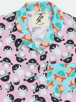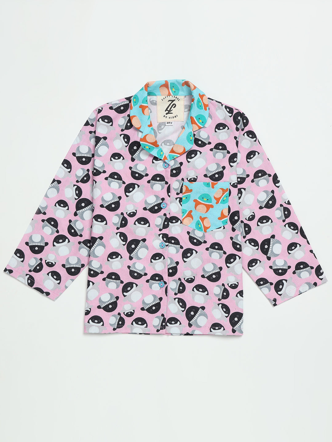 DESCRIPTION: Super soft premium cotton fabric with cool and colourful Squish-mallow print. Comfy button front top & loose straight leg PJ pant.