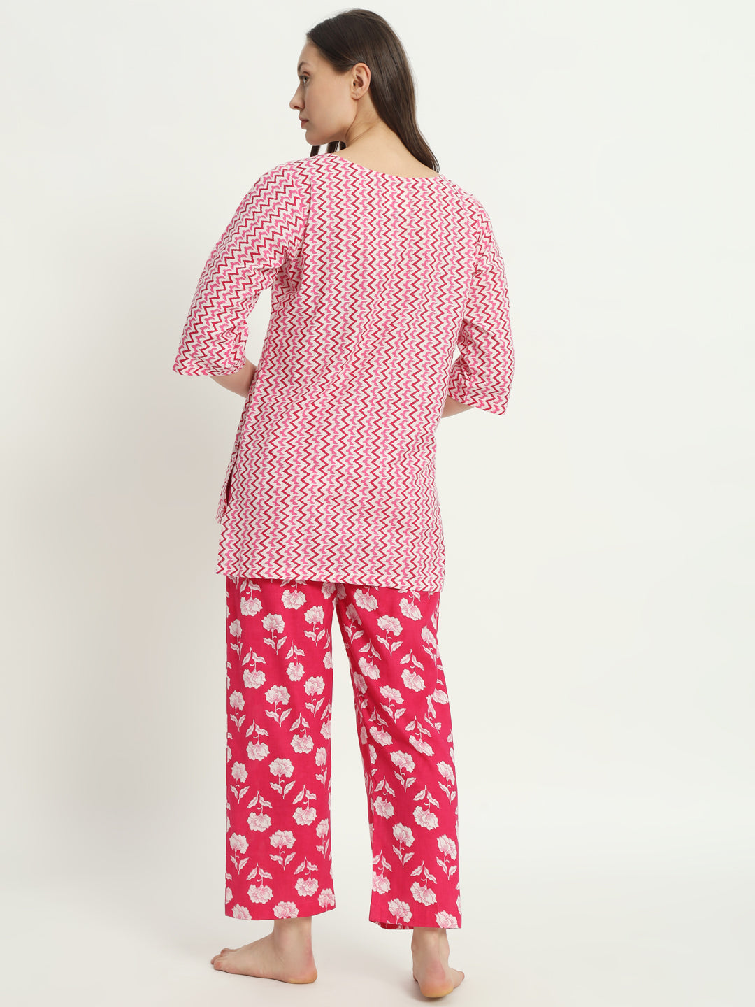 DESCRIPTION: Pure Cotton screen print crafted with the finest breathable fabrics made in comfortable Hi-Low kurti style to keep you cool and relaxed. Loose fit with 3/4th sleeves & full length elasticated pajama.